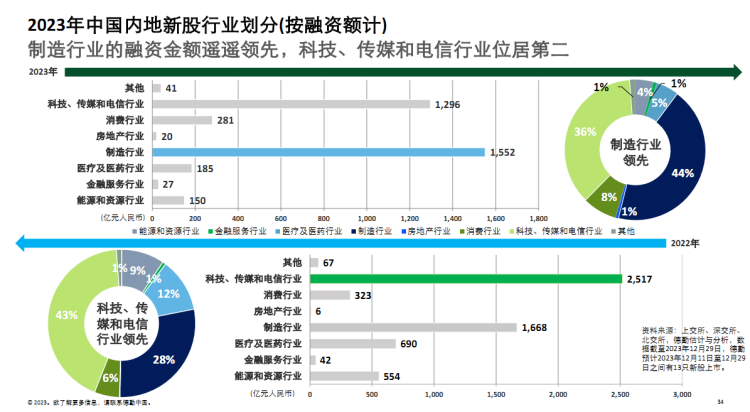 截至 2023 年 12 月 31 日,中国内地将有约 310只新股融资约 3,551 亿元人民币。上海证券交易所(上交所)将有 103 只新股融资 1,933 亿元人民币;深圳证券交易所(深交所)将有约 132 只新股融资 1,477 亿元人民币。北交所将有 75家新公司上市融资141 亿元人民币。创业板仍将会是新股发行数量最多的市场板块,而上海科创板则将会是募集新股资金最多的市场。创业板和科创板两个市场板块的融资总额将超过两个主板市场。