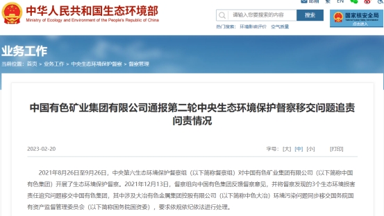 同日,生态环境部网站公布了《中国有色矿业集团有限公司通报第二轮中央生态环境保护督察移交问题追责问责情况》。2021年8月26日至9月26日,中央第六生态环境保护督察组(以下简称督察组)对中国有色矿业集团有限公司(以下简称中国有色集团)开展了生态环境保护督察。2021年12月13日,督察组向中国有色集团反馈督察意见,并将督察发现的3个生态环境损害责任追究问题移交中国有色集团,其中涉及大冶有色金属集团控股有限公司(以下简称中色大冶)环境污染问题同步移交国务院国有资产监督管理委员会(以下简称国务院国资委),要求依规依纪依法进行处理。