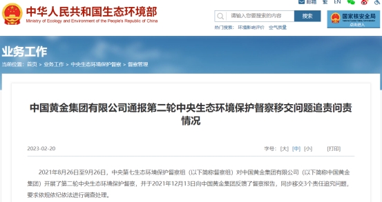 中国经济网北京2月22日讯 2月20日,生态环境部网站公布了《中国黄金集团有限公司通报第二轮中央生态环境保护督察移交问题追责问责情况》。2021年8月26日至9月26日,中央第七生态环境保护督察组(以下简称督察组)对中国黄金集团有限公司(以下简称中国黄金集团)开展了第二轮中央生态环境保护督察,并于2021年12月13日向中国黄金集团反馈了督察报告,同步移交3个责任追究问题,要求依规依纪依法进行调查处理。
