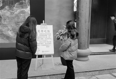 昨晚8时许,在鹿城区欧洲城老温州餐厅前,一位中年人在这个“免费吃饭”的告示牌前看了又看,犹豫一会儿后,快步来到老温州餐厅,向服务员要了一份“单人套餐”。