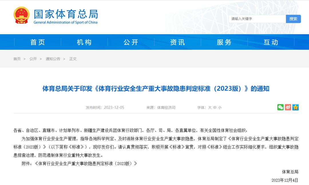 《体育行业安全生产重大事故隐患判定标准(2023版)》