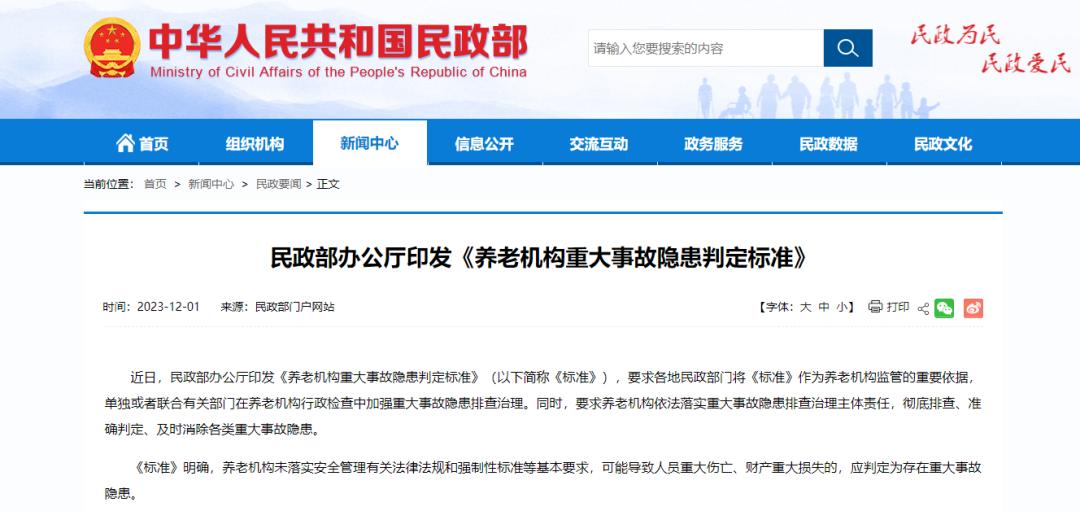 近日,民政部办公厅印发《养老机构重大事故隐患判定标准》。