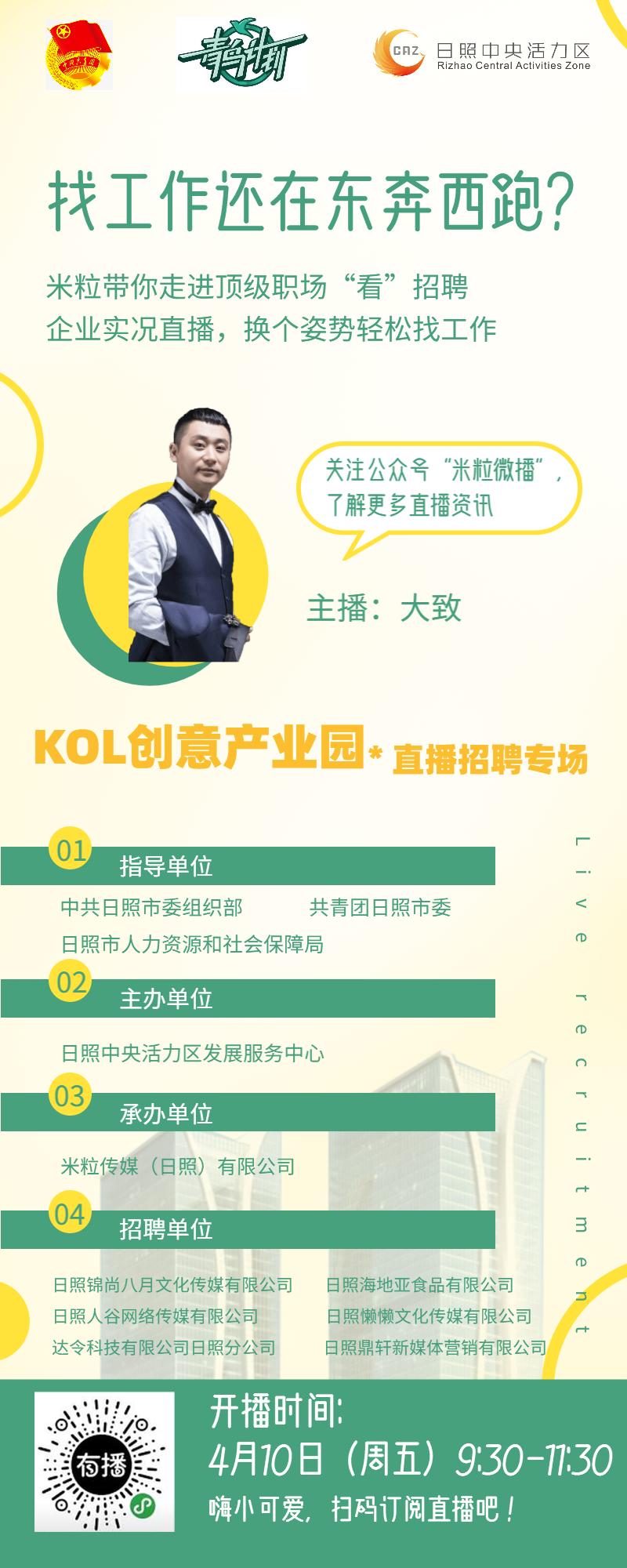 原标题:《青鸟计划|4月10日上午9:30,日照市网络直播招聘会(KOL创意产业园专场)期待您的关注!⑤》