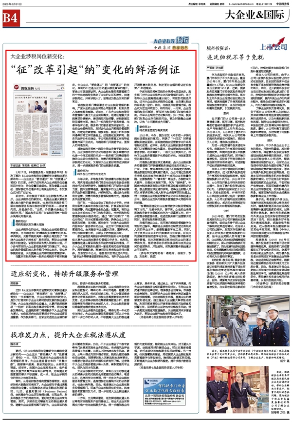 3月17日,《中国税务报·纳税服务专刊》刊发了题为《从企业涉税岗位设置新变化看税法遵从新动向——企业正从“要我遵从”向“我要遵从”转变》的文章,分析了近年来大企业涉税岗位设置的四大变化:岗位设置日益细化、更加看重从业经验、国际税收岗位增多和出现复合型岗位,引发税企双方的广泛讨论。