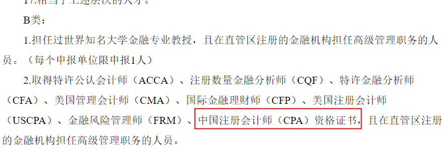 2022年四川注册会计师奖励与补贴标准是多少根据《四川天府新区成都直管区“天府英才计划”实施办法(修订版)》,取得中国注册会计师(CPA)资格证书,且在直管区注册的金融机构担任高级管理职务的人员属于高级人才B类。