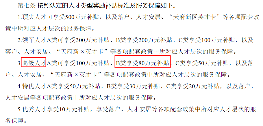 且根据该办法中第七条规定,高级人才B类可享受80万元补贴以及落户、人才安居、“天府新区英才卡”等各项配套政策中所对应人才层次的服务保障。
