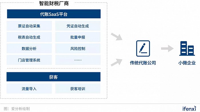 如上文所述,一类智能财税厂商以SaaS代账工具做为产品提供给传统代账公司,使其从获客能力和服务能力两方面提升。换句话说,这类智能财税厂商是横向帮助传统代账公司转型,但自身并不接触终端小微企业。这类代账SaaS公司提供全流程智能代账平台给传统代账公司使用,平台中包含了票据采集、凭证生成、税表生成,并可以通过OCR、RPA等技术实现一键批量申报,满足代账公司的代账和申报业务的工具需求。同时,SaaS平台中还包括数据分析和风控系统。数据分析包含客户数据分析及管理数据分析,提升代账公司的客户管理能力和门店管理能力,提升代账效率。客户数据分析可以根据账套数据检测代账公司的客群结构、分布以及客户风险等,保证代账公司的运营健康度;管理数据分析可以有效管理门店人员的绩效,使门店管理者可以实时监督门店人员的代账情况。风控系统是提供给代账公司的客户风控管理工具,可以检测客户的多项财税风险,比如,某企业账卡核对不服或凭证审核未完成,都可以在平台上展示出来。代账公司门店人员可以提醒客户及时处理,避免风险。对于代账公司来讲,提升了自身的服务能力;对于客户来讲,服务体验得到了提升。除智能代账SaaS外,这类智能财税SaaS公司还提供传统代账公司客户引流和获客培训的获客服务。客户引流主要靠电销方式,帮助传统代账公司获客,降低营销成本。同时,通过获客培训,可以提升门店的销售能力。通过工具赋能,传统代账公司的代账效率会有2-4倍不等的提升,有效扩大服务半径及服务能力。根据爱分析调研,此类智能财税厂商的收费分为账套数和SaaS订阅两种收费,平均每套账收取10-30元不等,毛利率较高,在90%左右。
