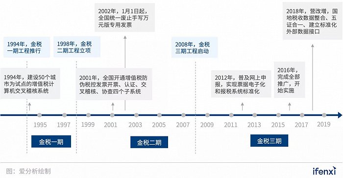 金税三期:2008年,国家发改委正式批准金税三期工程初步设计方案和中央投资概算,三期工程正式启动。基于发展“税务信息化”的目标,以“一个平台、两级处理、三个覆盖、四个系统”为建设目标,“金三”构建了全国统一的税收征管系统和大数据平台,基层税务数据集中化,通过分析数据,全面监管。