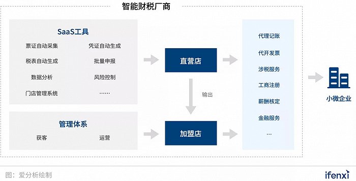 市场中的另一类智能财税厂商以工具+门店服务的模式,直接服务于终端小微企业。这类智能财税厂商与上述赋能传统代账公司的智能财税厂商相同,具备一整套代账SaaS工具。但与其不同的有两点:一是这类智能财税厂商有自营和加盟的线下门店,直接面向终端小微企业;二是这类智能财税厂商除提供代账服务外,同时也提供纯SaaS工具厂商没有的增值服务。
