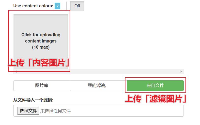 我们需要上传两张图片,第一张图片作为「内容图片」,第二种图片作为「滤镜图片」,网站会使用第一张图片的内容以及第二张的风格进行重新合成。
