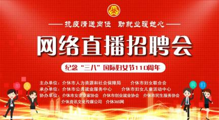 介休2020“抗疫情送岗位 助就业暖她心”专场网络招聘会于3月6日——3月1日共开播6场网络直播招聘。 本次网络招聘会从3月1日持续到3月底,历时一个月,共有上百家企业参与。