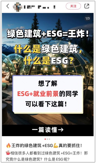 除此之外,面试培训和留学中介也不愿错过这个商机。以留学中介为例,夸张的标题,让人误以为自己下一秒就将走上人生巅峰,例如“XXXX(某某专业)+ESG=王炸!”