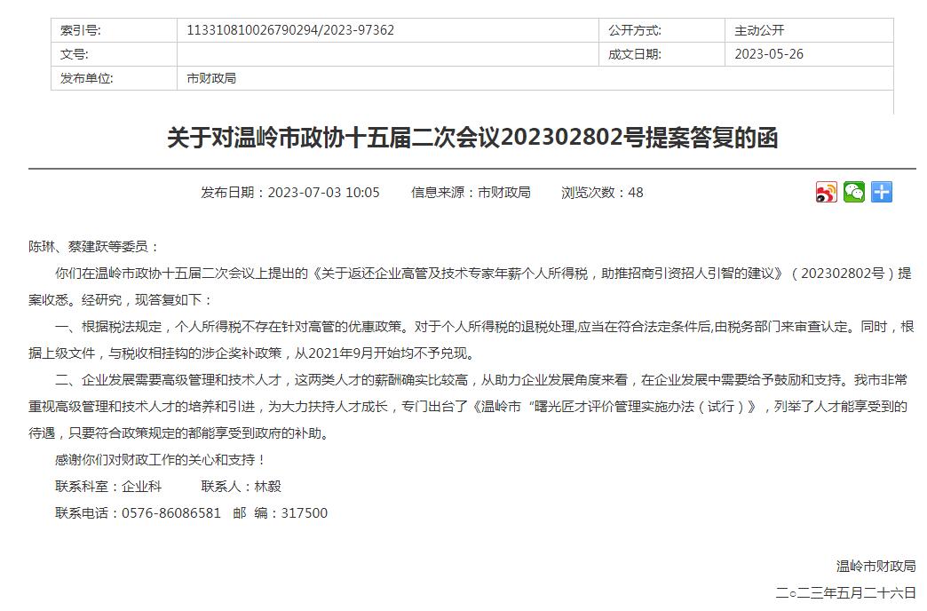针对陈琳、蔡建跃等委员在温岭市政协十五届二次会议上提出的《关于返还企业高管及技术专家年薪个人所得税,助推招商引资招人引智的建议》(202302802号)提案,温岭市财政局答复称,根据税法规定,个人所得税不存在针对高管的优惠政策。对于个人所得税的退税处理,应当在符合法定条件后,由税务部门来审查认定。同时,根据上级文件,与税收相挂钩的涉企奖补政策,从2021年9月开始均不予兑现。