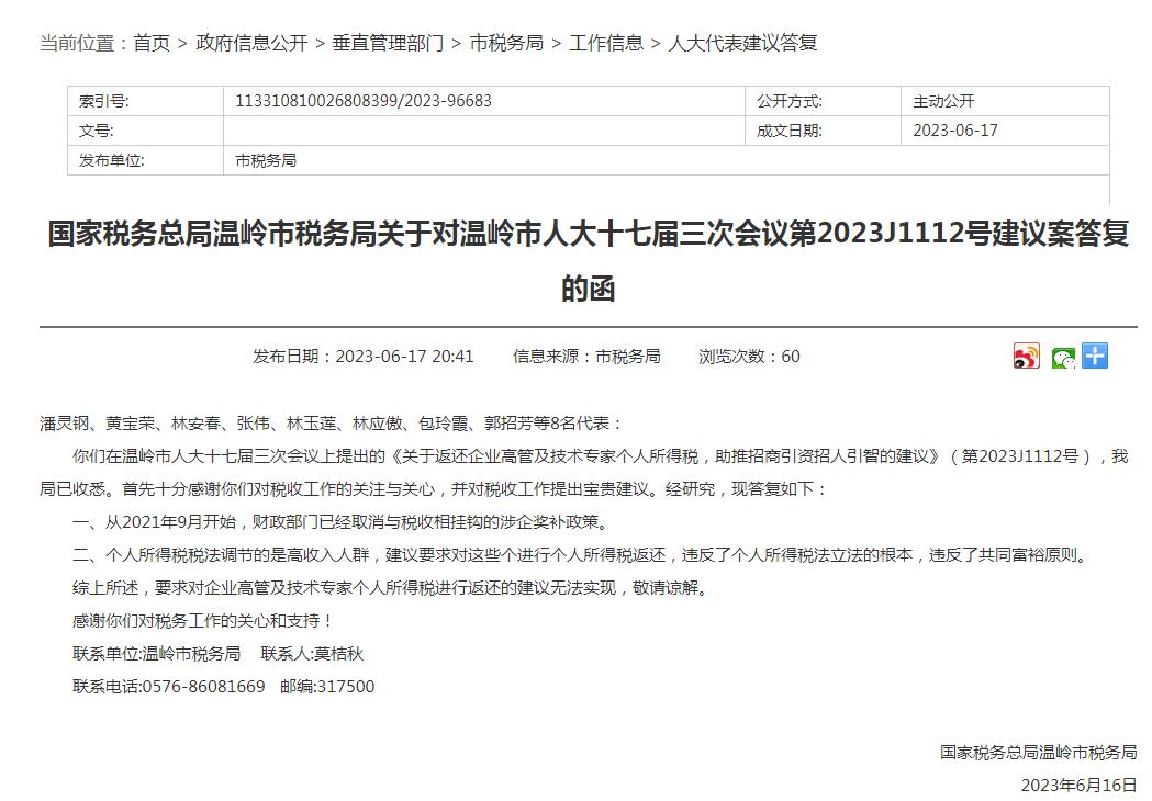 针对潘灵钢、黄宝荣、林安春、张伟、林玉莲、林应傲、包玲霞、郭招芳等8名代表在温岭市人大十七届三次会议上提出的《关于返还企业高管及技术专家个人所得税,助推招商引资招人引智的建议》,国家税务总局温岭市税务局则表示,从2021年9月开始,财政部门已经取消与税收相挂钩的涉企奖补政策。