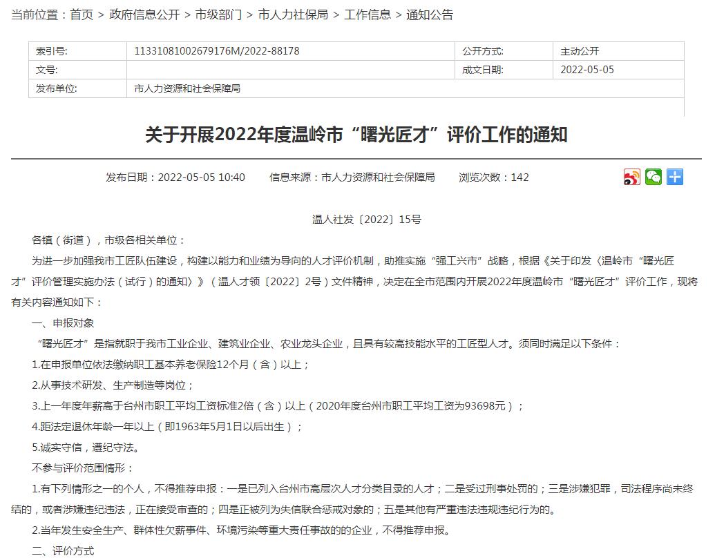 此外,关于温岭市财政局在前述答复中提到的《温岭市“曙光匠才”评价管理实施办法(试行)》,据温岭市政府网站2022年5月发布的消息显示,根据《关于印发〈温岭市“曙光匠才”评价管理实施办法(试行)的通知〉》(温人才领〔2022〕2号)文件精神,温岭市决定在全市范围内开展2022年度“曙光匠才”评价工作。