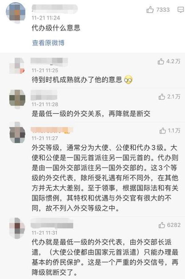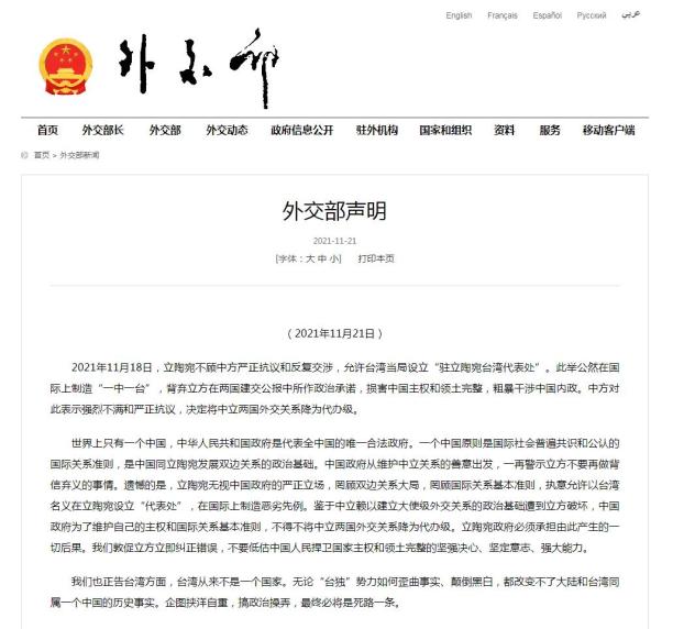 外交部11月21日发表声明,针对立陶宛不顾中方严正抗议和反复交涉,允许台湾当局设立“驻立陶宛台湾代表处”一事,中方表示强烈不满和严正抗议,决定将中立两国外交关系降为代办级。