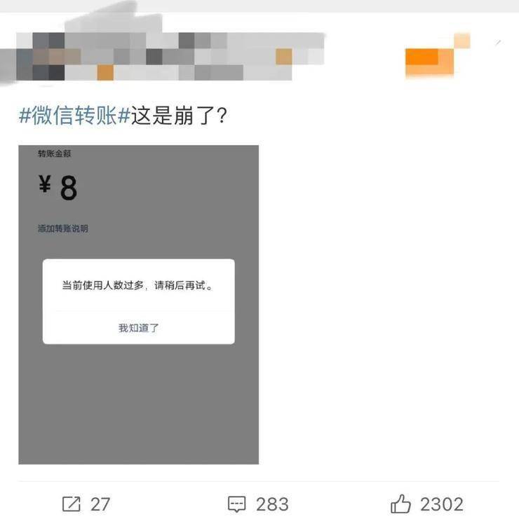 11月1日晚,多位网友反馈,微信支付以及语音通话等部分功能出现异常,例如微信转账时会提醒“当前使用人数过多,请稍后再试”。