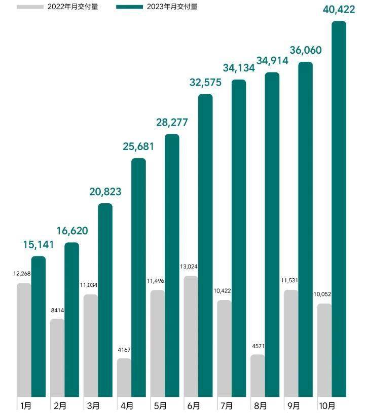 11月1日,理想汽车现公布了最新的 10 月交付数据。理想汽车本月共计交付新车 40,422 辆,同比增长 302.1%,月交付首次突破四万辆大关。截至 2023 年 10 月 31 日,理想汽车全年累计交付 284647 辆。