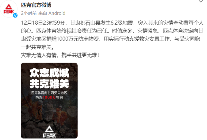 匹克在官方微博表示,决定向甘肃受灾地区捐赠1000万元防寒物资,用实际行动支援救灾安置工作,与受灾同胞一起共克难关。