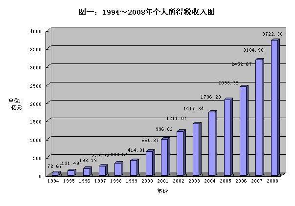个人所得税经过不断发展,在组织财政收入和调节收入分配等方面发挥着越来越重要的作用。自1980年个人所得税开征以来,收入连年大幅增长,特别是1994年新税制实施以来,个人所得税收入以年均34%的增幅稳步增长。1994年,我国仅征收个人所得税73亿元,2008年增加到3722亿元(详见图一)。1994年~2008年,个人所得税收入占GDP的比重由0.2%上升至1.2%,占税收收入的比重由1.4%上升至6.4%。个人所得税是1994年税制改革以来收入增长最为强劲的税种之一,目前已成为国内税收中的第四大税种,在部分地区已跃居地方税收收入的第二位,成为地方财政收入的主要来源。个人所得税收入的快速增长,与我国经济的 快速发展和居民收入水平的提高、税收征管能力的不断加强以及全社会纳税意识的增强是密不可分的。国家收了这些税收,经过财政二次分配,向低收入群体倾斜,以达到调节收入分配的目的。
