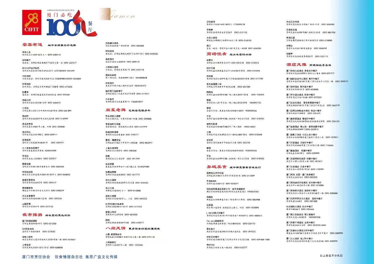海峡之声广播电台9月9日厦门消息(记者 陈必扬)厦门必吃100家餐厅( 2024版)榜单近日发布,该榜单由中国(厦门)国际投资促进中心联合厦门市烹饪协会、饮食情报杂志社及厦门市多家主流媒体共同评选。榜单分为宴客有道、夜市排档、闽菜老牌、八闽风情、商场佳肴、异域美食、酒店风雅七大板块。