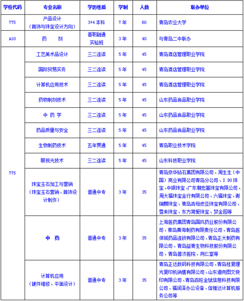 普职融通实验班与青岛二中联办,双方签订人才培养协议,共同制定人才培养方案,部分师资共享。学制三年,重点学习春季高考的文化课和专业基础及技能测试的专业课,实验班最低录取分数线青岛市统一划定。实验班根据专业特点和学生实际情况,主要组织学生参加春季高考力争升入本科。与青岛二中实施普职融通,特别优秀学生通过二中考核合合格,可转入二中学习。2019年春季高考招收医药类专业本科院校名单:齐鲁医药学院、齐鲁理工学院、山东协和学院、德州学院、泰山学院、菏泽学院、潍坊学院、枣庄学院、山东现代学院等。