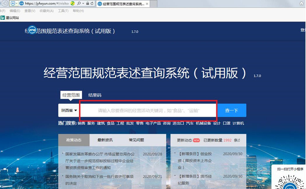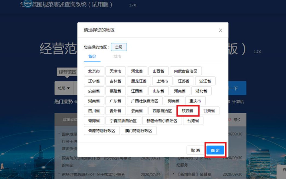 1、打开电脑浏览器输入网址“jyfwyun.com”,登录国家市场监督管理总局经营范围规范表述查询系统,选择“陕西省”,点击“确定”进入系统查询陕西地区现有条目。