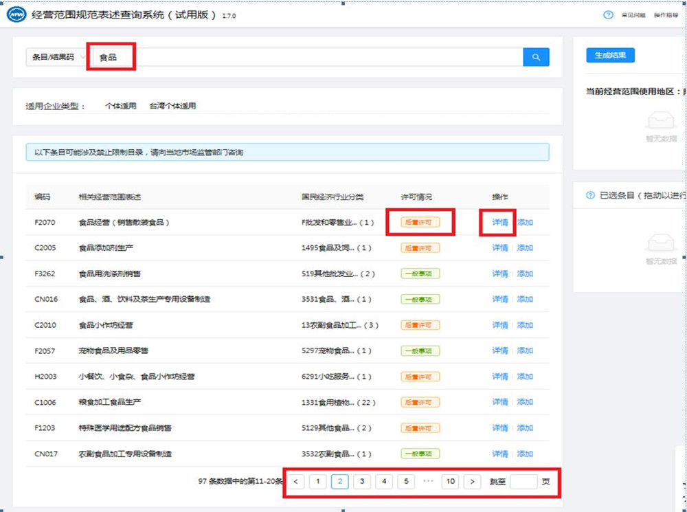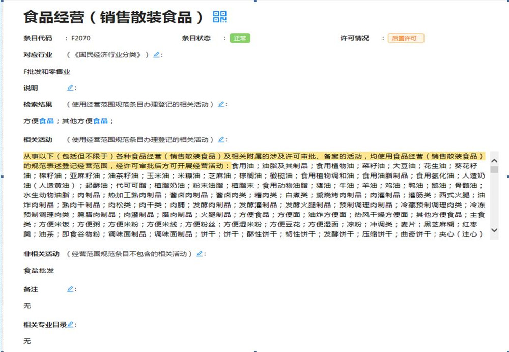 2、输入要查询的经营活动关键字,如您想开超市售卖小零食,您可以在“条目/结果码”一栏中,输入“食品”,查询相关的条目信息。