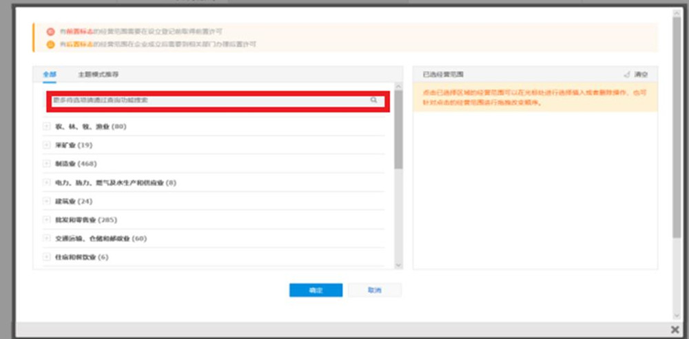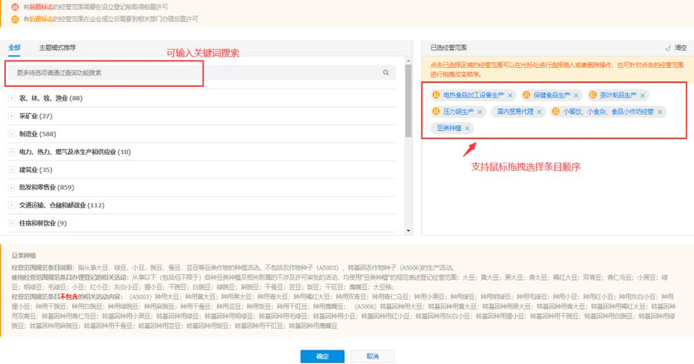 5、下图所示“搜索”功能,搜索范围为:经营范围表述或经营范围表述说明中所包含的词语;已选经营范围支持鼠标拖拽调整条目顺序。