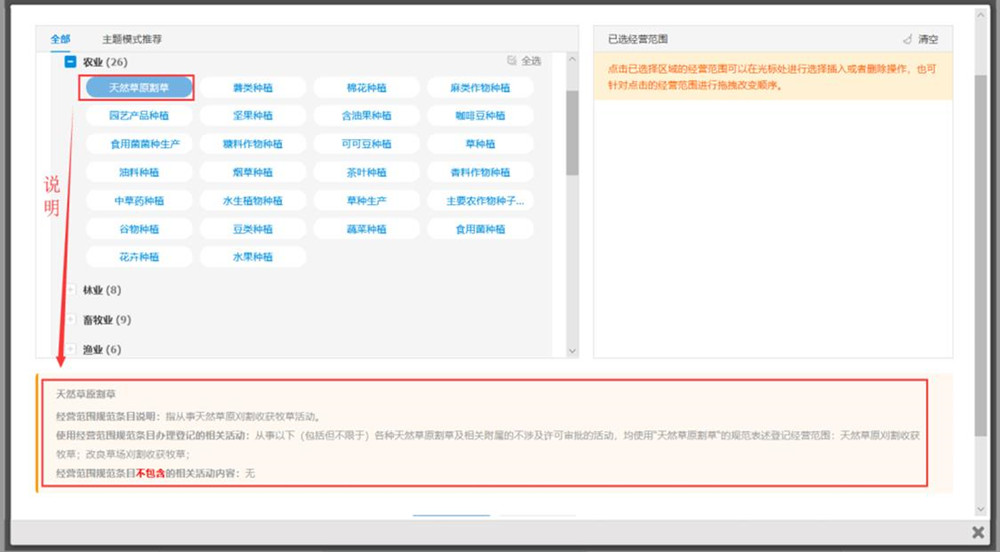 3、当鼠标放置在需要选择的经营范围描述上时,页面下方会显示出该经营范围的具体描述,如下图所示。