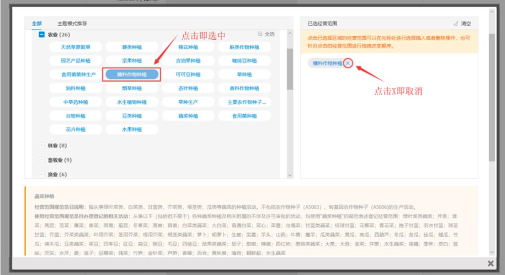 4、在经营范围描述中,点击即选中(左侧);右侧展示为已经勾选的经营范围,点击X即取消。