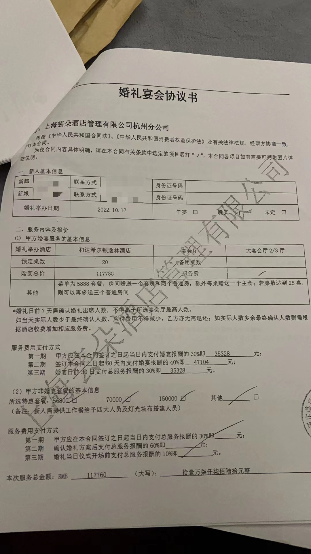 据褚女士提供的《婚礼宴会协议书》,乙方为上海芸朵酒店管理有限公司杭州分公司,甲方为褚女士。婚礼举办酒店为和达希尔顿逸林酒店,预订桌数为20桌,婚宴总价为11.7万元。《婚礼宴会协议书》上写明,服务费用分为三期支付。