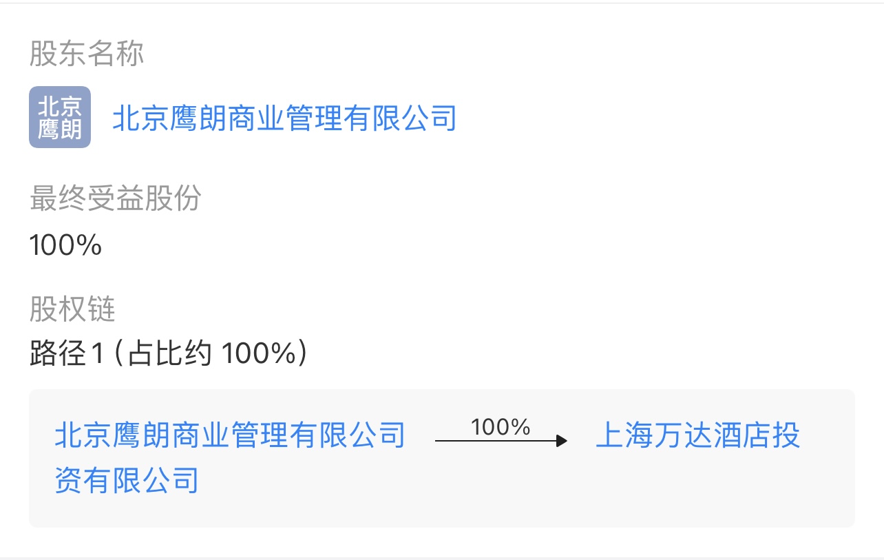12月26日,澎湃新闻()发现,12月19日,上海万达酒店投资有限公司发生股权变更,原先的股东大连万达商业管理集团股份有限公司退出,新增股东北京鹰朗商业管理有限公司,持股比例100%。