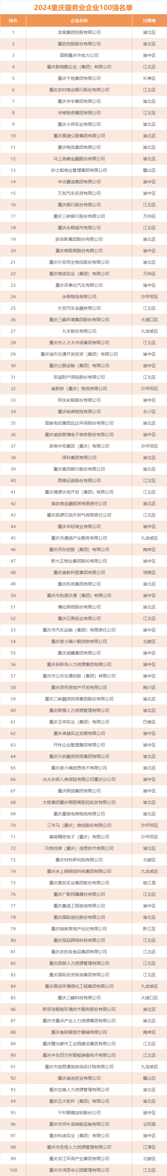 龙湖集团以2023年营业收入1807亿元,稳居2024重庆服务业企业100强第一名,2至10名依次是重药控股、国网市电力公司、新鸥鹏集团、千信集团、市农商银行、华宇集团、华南物资、小传实业、高速公路集团。