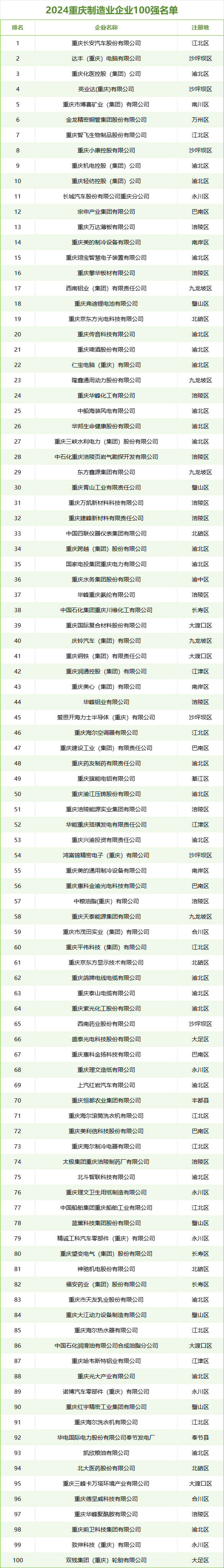 2024重庆制造业企业100强排名第1的是长安汽车,连续21年蝉联重庆制造业企业“冠军”。2至10名依次是达丰电脑、化医集团、英业达公司、博赛集团、金龙铜管、智飞生物、小康控股、机电集团、轻纺集团。