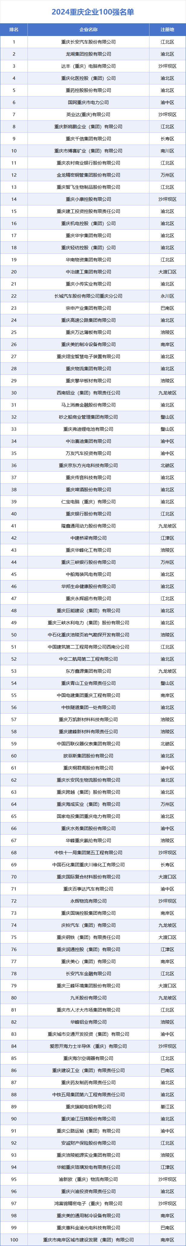 9月25日,在由重庆市经济和信息化委员会的指导,重庆市企业联合会(企业家协会)、重庆市工业经济联合会召开的2024重庆百强企业发布会上,揭晓了2024重庆企业100强榜单,同期发布了2024重庆制造业企业100强、重庆服务业企业100强名单及分析报告。