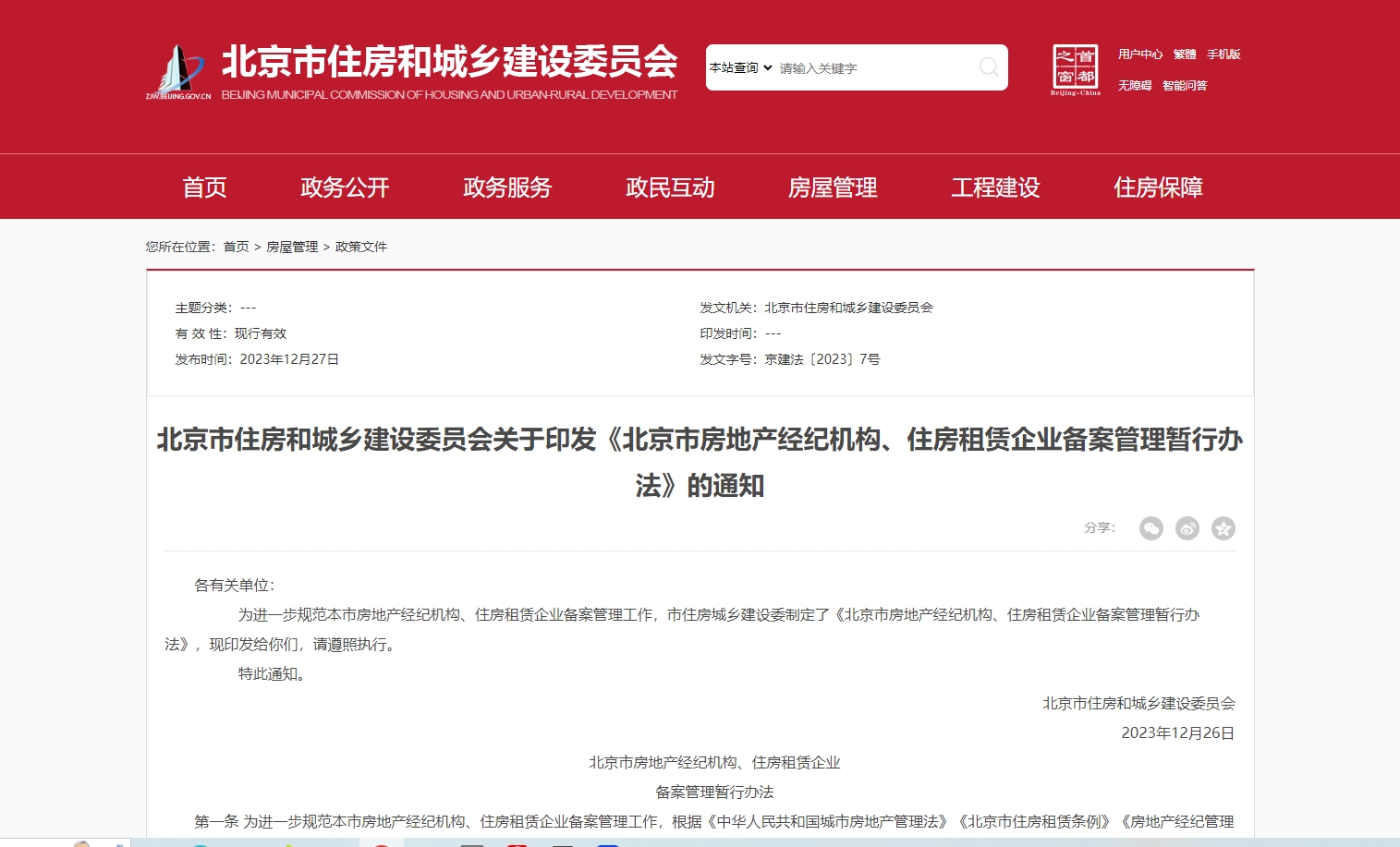 《办法》自2024年1月1日起施行。《北京市住房和城乡建设委员会关于加强房地产经纪机构备案及经营场所公示管理的通知》(京建法〔2018〕3号)同时废止。