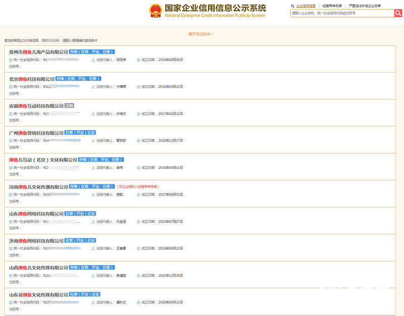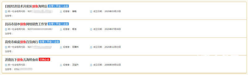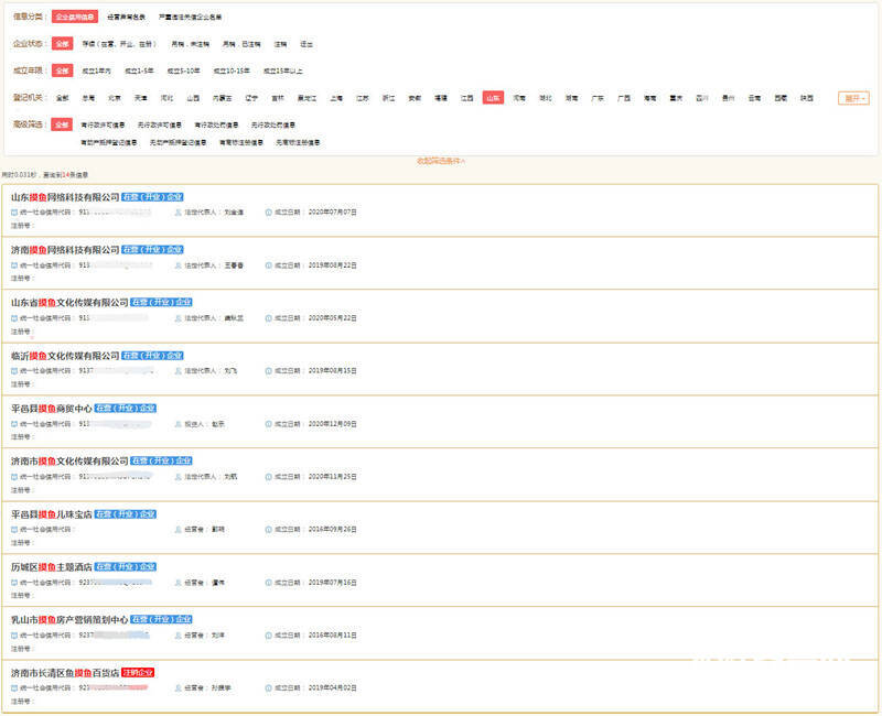 除了对“上班”动脑筋,企业主也在“摸鱼”上动了脑筋。国家企业信用信息公示系统中显示,全国共有100余家企业名称中有“摸鱼”二字,其中山东有14家。