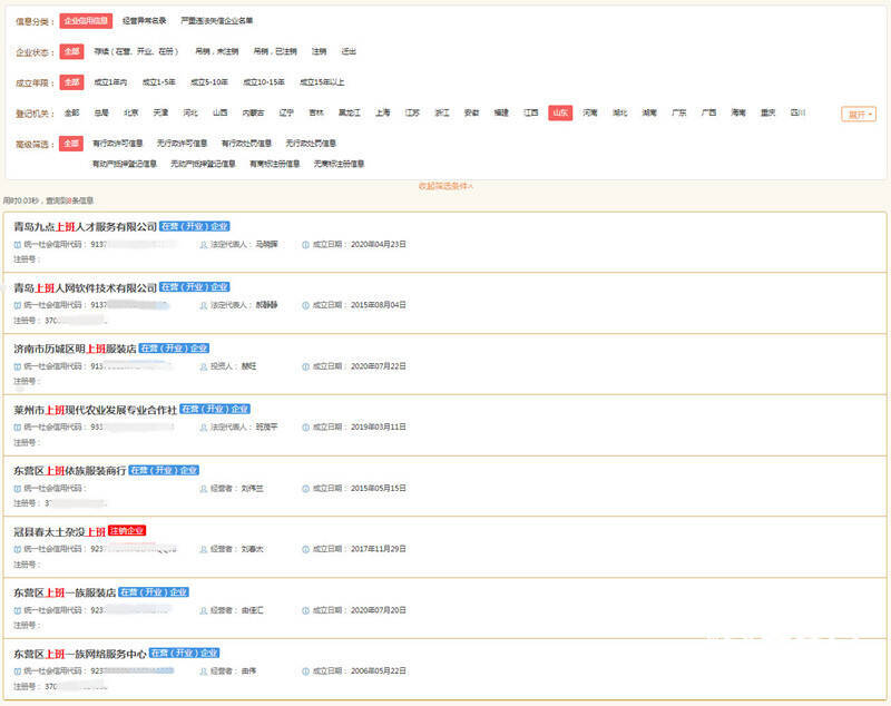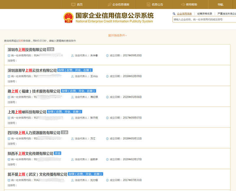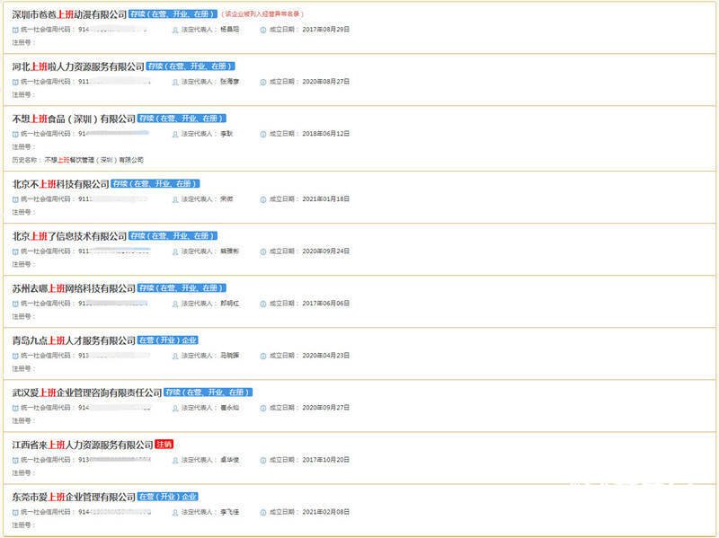 在山东,有8家企业名称中有“上班”两字,包括“九点上班”“上班一族”等。