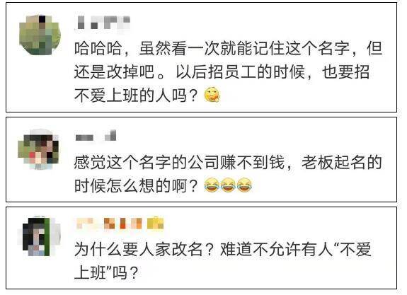 网友们也对此持有各自的观点,“虽然看一次就能记住这个名字,但还是改掉吧。以后招员工的时候,也要招不爱上班的人吗?”“感觉这个名字的公司赚不到钱”“为什么要人家改名?难道不允许有人‘不爱上班’吗?”,也有网友为企业主“支招”:“不字后面加一个小小的逗号。”