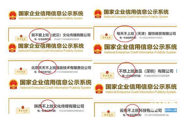 闪电新闻记者在国家企业信用信息公示系统查询发现,全国多地都有类似的公司名字,“每天不上班”“不想上班”“天天不上班”,而除了这些“不想上班”的公司名称,还有不少“上班喽”“早上班”“趣上班”“爱上班”的公司名称。