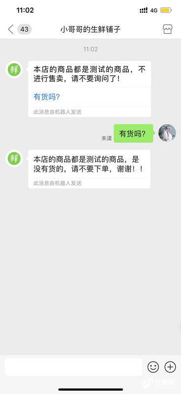 闪电新闻记者登录了这家企业经营的网店,店铺名称为“小哥哥的生鲜铺子”,但是仅有5件产品,产品名称都十分别致,“1电动小车车小车车小车车小”“1海绵宝宝你好呀一起加油22”“1123的发放是假的假的假的”。闪电新闻记者试图通过客服联系上店主,询问公司起名原因和公司经营产品,却发现店主设置了机器人发送的自动回复“本店的商品都是测试的商品,不进行售卖,请不要询问了!”“本店的商品都是测试的商品,是没有货的,请不要下单,谢谢!!”