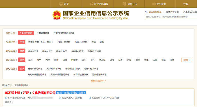 闪电新闻记者登录国家企业信用信息公示系统看到,位于武汉市洪山区野芷湖创意天地的“就不爱上班(武汉)文化传播有限公司”,成立于2017年7月31日,登记机关为武汉市洪山区市场监督管理局,经营范围涉及文化艺术交流活动策划、展览展示服务等。