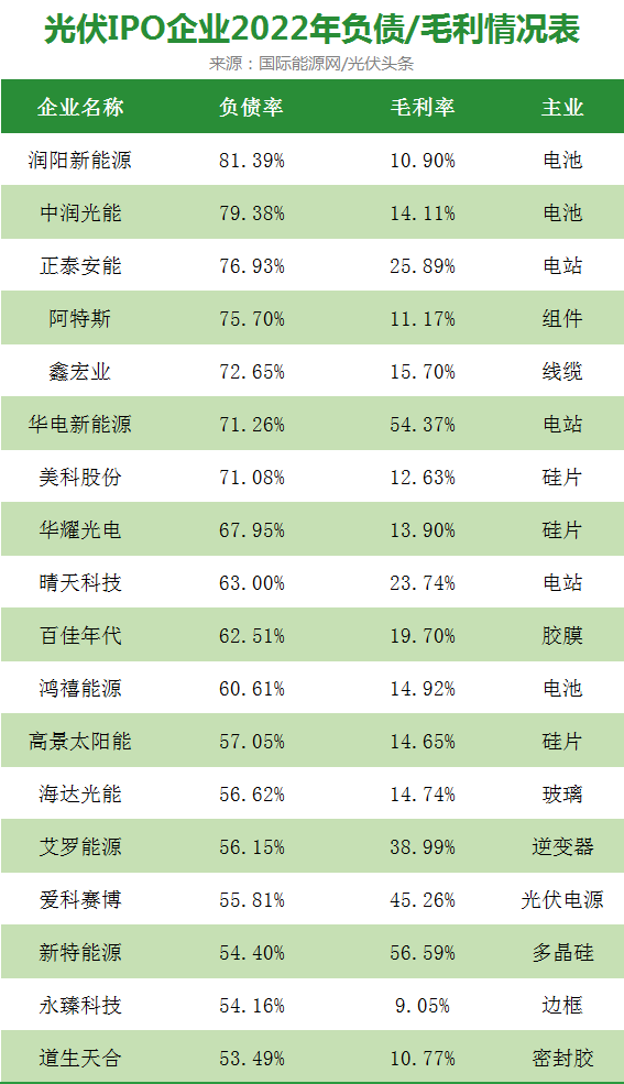 据国际能源网光伏头条统计,在今年排队IPO的43家企业之中,有18家企业2022年的负债率超50%。其中、润阳新能源、中润光能、正泰安能、阿特斯、鑫宏业、华电新能源、美科股份等7家企业负债率更是超过70%。