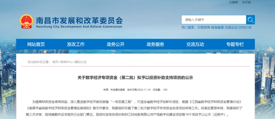 据介绍,经县区推荐申报,南昌市发改委组织了第三方评审、现场踏勘并征求相关行业部门意见,将拟安排投资补助的江铃控股有限公司产线数字化建设项目等14个项目予以公示。对公示项目如有异议,可于2024年11月22日前向南昌市发展和改革委员会(数字经济科)反映。