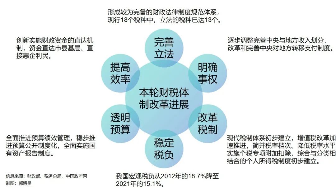 为此,党的十八届三中全会以来的本轮财税体制改革,以“基本建立现代财政制度”为目标,重点围绕“改进预算管理制度、完善税收制度、建立事权和支出责任相适应的制度”三大任务开展。经过十年努力,目前,标准科学、规范透明、约束有力的预算制度基本建立;税种科学、结构优化、法律健全、规范公平的税收制度体系建立健全;权责清晰、财力协调、区域均衡的中央与地方财政关系逐步形成。