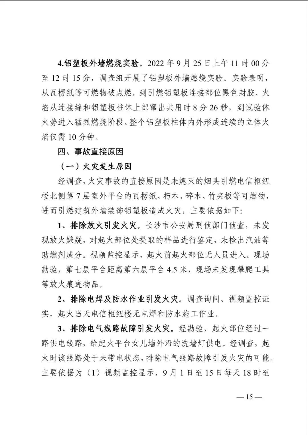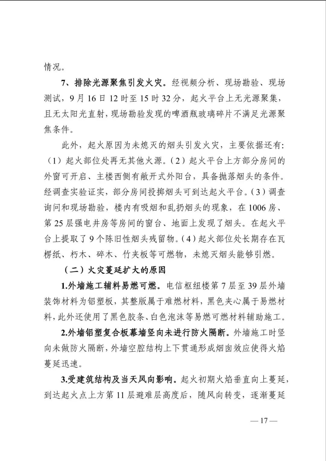 经调查,火灾事故的直接原因是未熄灭的烟头引燃电信枢纽楼北侧第7层室外平台的瓦楞纸、朽木、碎木、竹夹板等可燃物,进而引燃建筑外墙装饰铝塑板造成火灾。