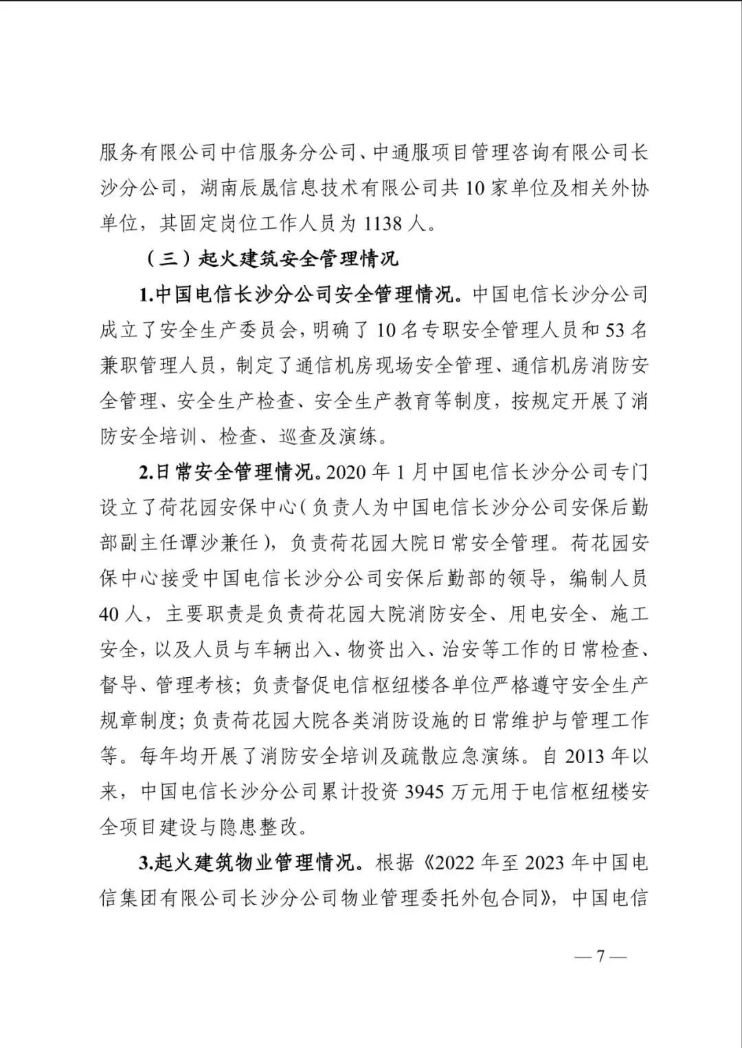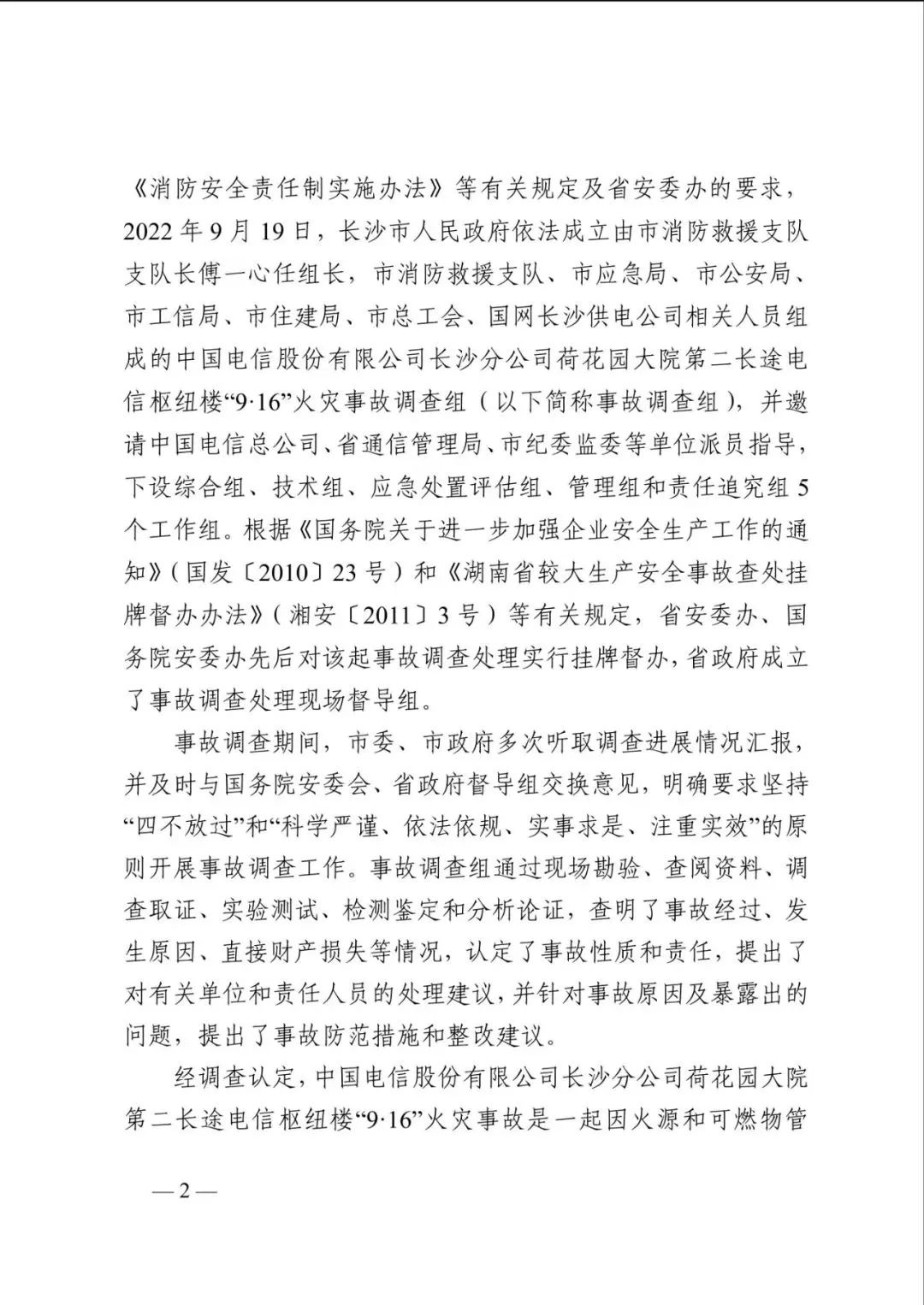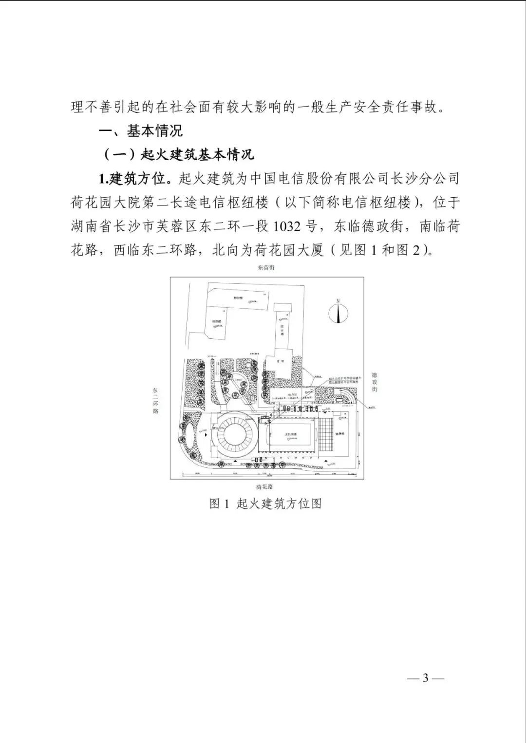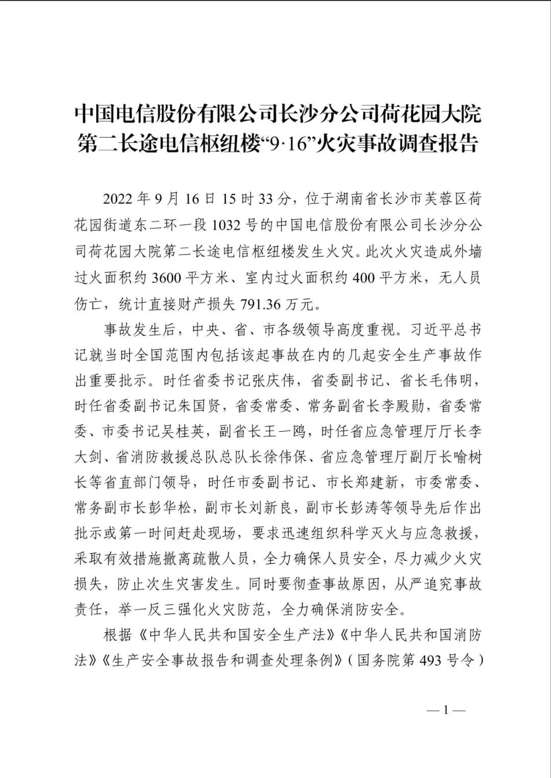 近日,湖南省长沙市应急管理局公布了《中国电信股份有限公司长沙分公司荷花园大院第二长途电信枢纽楼“9·16”火灾事故调查报告》。