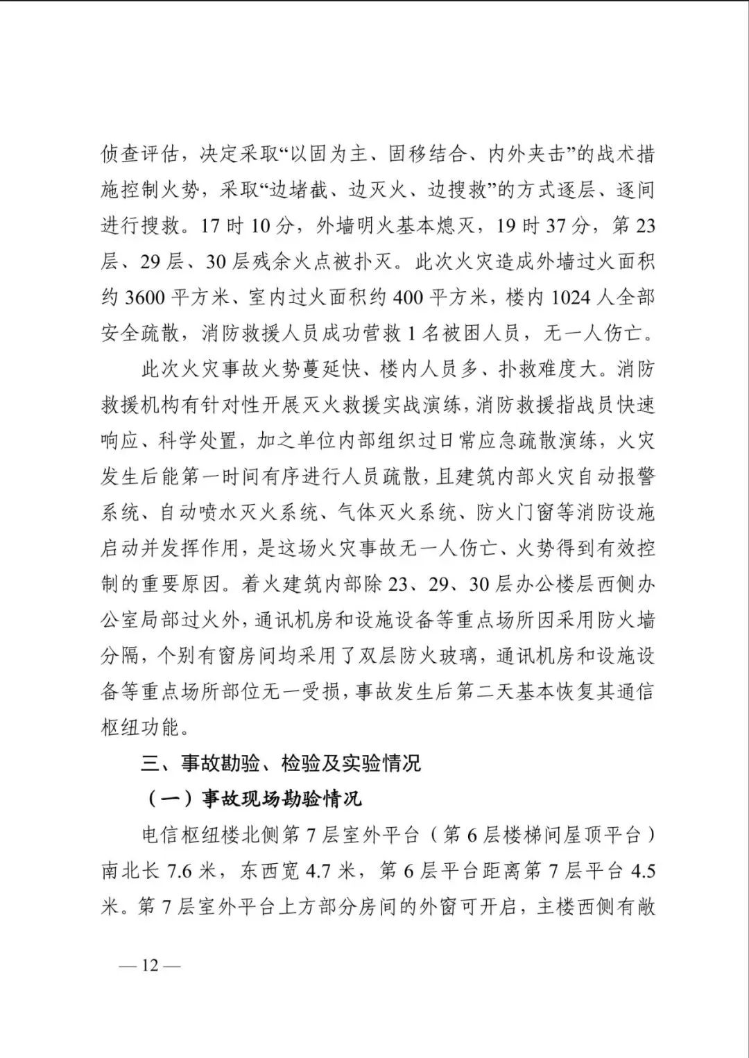 3.受建筑结构及当天风向影响。起火初期火焰垂直向上蔓延到达起火点上方第11层避难层高度后,随风向转变,逐渐蔓延至主楼西侧外墙,并顺势向上蔓延,经过敞开式阳台门窗火势蔓延进入办公房间。