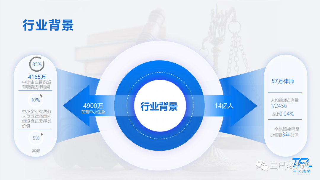 目前市场上存在着巨大的法务人员缺口。根据数据显示,全国共有4900万在营中小企业,但是其中4165万中小企业并未雇佣任何法律顾问,占到整体的85%。